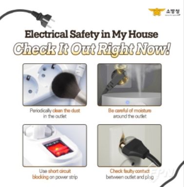 전기화재 예방수칙은 주기적으로 콘센트 내 먼지 청소, 콘센트·플러그 접촉 불량 확인, 문어발식 콘센트 사용 금지, 차단 기능이 있는 멀티탭 사용, 사용하지 않는 플러그 뽑기 등이다.