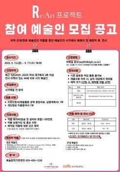 [제주교통복지신문 김강석 기자] (재)대구문화예술진흥원이 운영하는 대구예술발전소는 5월 12일부터 5월 17일까지 Re:Art 프로젝트 참여 청년 예술인을 공개 모집한다.