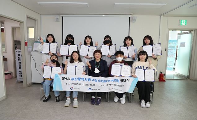 ‘청소년참여위원회’는 청소년 관련 정책 모니터링과 의견 제안 등의 활동을 펼치는 청소년 참여기구로, 공개모집 등을 통해 중구에 거주하거나 관내 학교에 재학 중인 만 9~24세 청소년 12명으로 구성됐다.