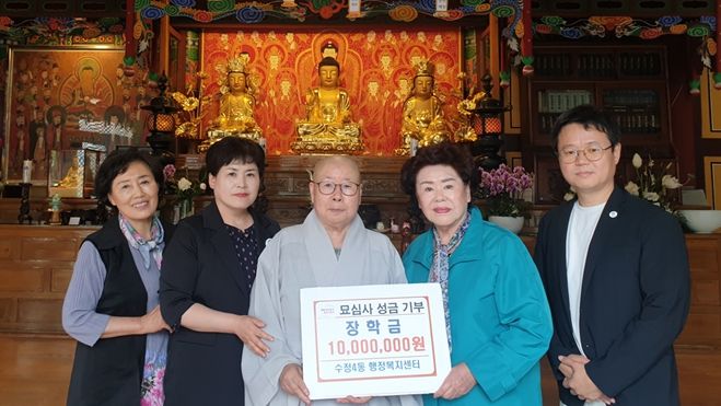 [제주교통복지신문 김강석 기자] 부산 동구 수정4동 소재 묘심사에서는 부처님 오신 날을 맞아 관내 저소득 가정 초·중·고·대학생 11명을 대상으로 장학금 1,000만원을 전달했다.