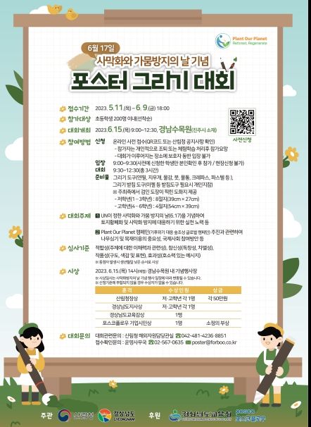 [제주교통복지신문 김강석 기자] 산림청은 국제연합(UN)이 정한'사막화와 가뭄 방지의 날' 기념행사(경남수목원, 6.15)의 하나로 실시될 포스터 그리기 대회(초등생)와 영어발표 대회(중·고생) 접수를 5월 11일부터 시작한다고 밝혔다.
