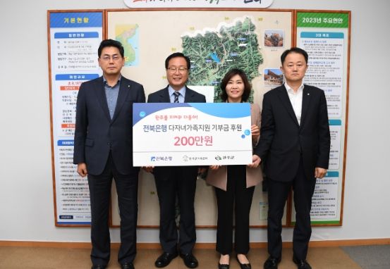 전북은행 사회공헌사업의 일환으로 전달받은 기부금은 저출산 위기에 대응해 다자녀 가구에 대한 긍정적 인식과 출산장려를 위한 ‘다둥이와 함께, 多모여 가족행사’에 쓰일 예정이다.