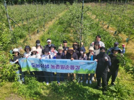 이날 일손돕기는 청주시립도서관과 미원면의 도농교류 상생협약에 따라 농번기 일손이 부족한 사과 농가를 찾아 사과적과 작업 등을 도왔다.