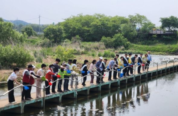 광산구는 11일 보건소, 민간방역업체, 지역주민 40여 명이 참여한 가운데 송산유원지에 미꾸라지 40kg을 방류했다. 이를 시작으로 앞으로 장수천 등 54개소에 260kg의 미꾸라지를 방류할 예정이다.