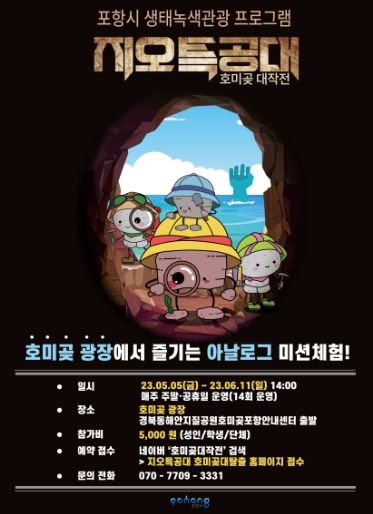 ‘지오특공대 호미곶 대작전’은 특별한 지질자원인 호미곶 해안단구(바다 계단)를 무대로 생태계 균형을 지키기 위해 돌의 정령과 함께 ‘지오특공대’를 꾸려 호미곶 지질을 조사하는 특공대 단원이 된다는 컨셉으로 진행되며, 미션을 해결하며 생태·해양관광의 중요성을 배우는 아날로그 체험이다.