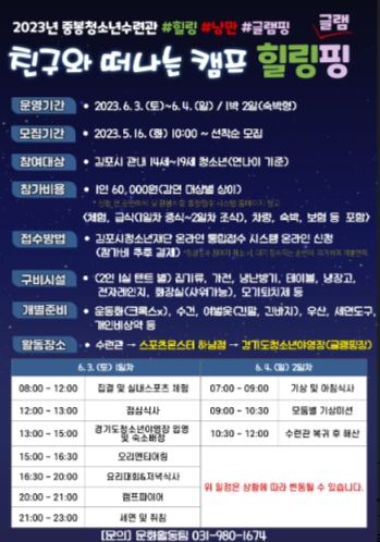 [제주교통복지신문 김강석 기자] (재)김포시청소년재단 김포중봉청소년수련관에서는 청소년의 심리적 안정과 에너지를 찾기 위한 숙박형 캠프를 6월 3일부터 6월 4일까지 이틀 간 운영한다고 밝혔다.
