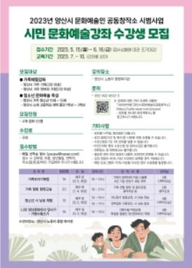 강좌는 양산시 노동자종합복지관에서 수강료와 재료비 일체 무료로 운영될 예정이며, 문화예술인 공동창작소 네이버 카페 6월 15일까지 수강생을 모집한다.