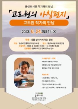 6월의 초청 작가는 '고도원의 아침편지'로 유명한 고도원 작가로 “나를 살아가게 하는 정신”을 주제로 6월 24일 토요일 오후 2시 웅상도서관 지하공연장에서 진행할 예정이다.