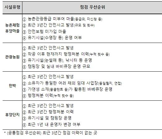 안전점검대상은 농촌체험휴양마을, 관광농원, 농어촌민박, 농어촌관광휴양단지 등의 농촌관광시설 3만 3천여 개소로, 최근 3년간 안전사고 발생 이력, 놀이시설 운영 여부 등에 따라 점검우선순위를 정하여 안전, 위생, 운영 형태 등을 확인한다.