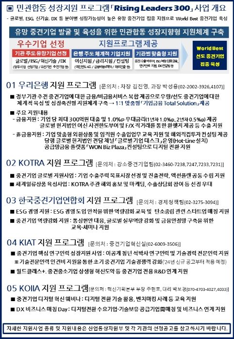 [제주교통복지신문 김강석 기자] 산업통상자원부와 우리은행(은행장 이원덕)은 5월 12일 중견기업 전용 금융지원 프로그램 '라이징 리더스(Rising Leaders) 300' 지원대상 기업을 모집한다.
