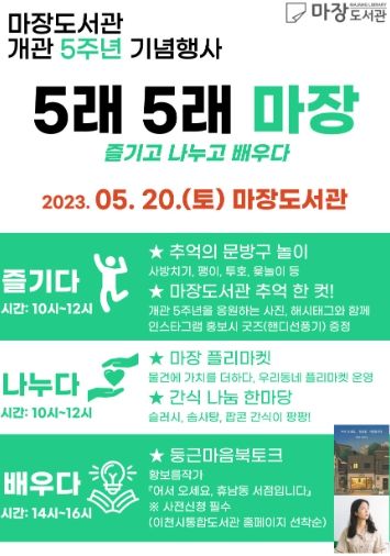[제주교통복지신문 김강석 기자] 이천시 이천마장도서관에서는 개관 5주년을 맞이하여 시민들의 사랑에 보답하고 자축하는 의미로 ‘5래 5래 마장’이라는 주제로 축제의 장을 마련했다고 밝혔다.