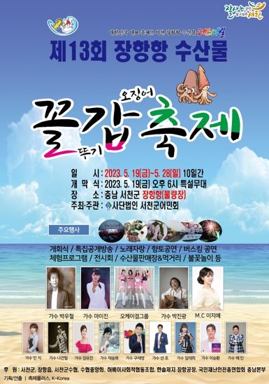[제주교통복지신문 김강석 기자] 서천군이 5월 19일부터 28일까지 장항항 물양장 일원에서 ‘제13회 장항항 꼴뚜기·갑오징어 축제’를 개최한다.