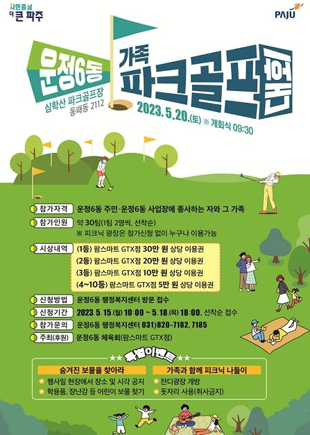 [제주교통복지신문 김강석 기자] 제1회 파주시 운정6동 가족 파크골프대회가 오는 20일 심학산 파크골프장에서 개최된다.
