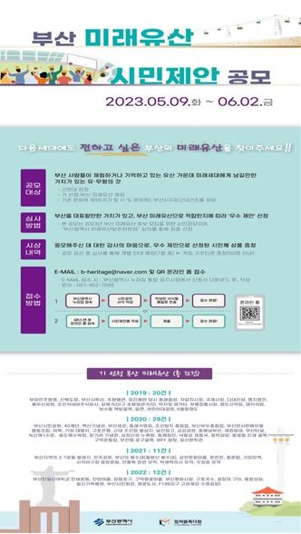 [제주교통복지신문 김강석 기자] 부산시는 오는 6월 2일까지 2023년 부산 미래유산 선정을 위한 ‘부산 미래유산 시민제안 공모’를 추진한다고 밝혔다.