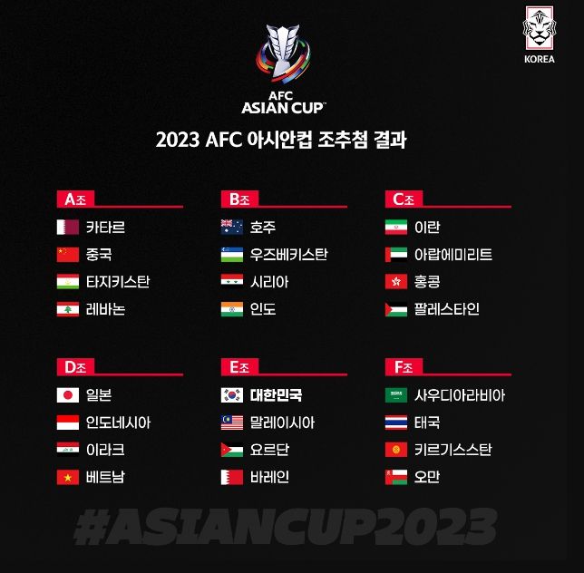 11일(한국시간) 카타르 도하의 카타라 오페라 하우스에서 2023 AFC 아시안컵 조추첨식이 열렸다. 조추첨 결과 한국은 말레이시아, 요르단, 바레인과 E조에 속하게 됐다. 한국은 국제축구연맹(FIFA) 랭킹이 이번 대회 출전국 중 3번째로 높은 27위로 1번 포트에 속해 개최국 카타르를 비롯해 일본, 이란, 호주, 사우디아라비아 등 강호를 피하게 됐지만 만만치 않은 상대들과 조별리그에서 붙게 됐다.