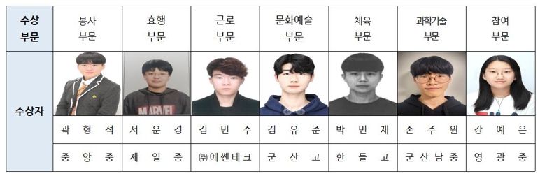 ▲ 문화예술 부문은 초등학생 때부터 무용에 관심을 가지고 여러 대회에서 수상하며 한국무용에서의 자신의 이름을 각인시키고 있는 군산고등학교 김유준 군이, ▲ 체육부문은 배구부 주장으로 학교 체육활성화에 이바지한 한들고등학교 박민재 군이, ▲ 과학기술 부문은 청소년수련관 KGYC동아리 부회장으로 로봇코딩 관련 뛰어난 창의성과 재능을 발휘해 여러 대회에서 수상한 군산남중학교 손주원 군이, ▲ 참여부문은 문화의 집에서 청소년운영위원회, 청소년 환경동아리 등에 적극 참여해 지역사회에 이바지하며 역량 개발을 위해 노력한 영광중의 강예은 양이 선정됐다.