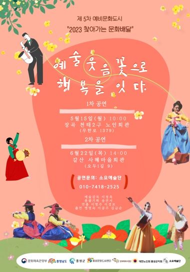 [제주교통복지신문 김강석 기자] 홍성군문화도시센터의 '2023년 찾아가는 문화배달'지원사업에 선정된 소요예술단의‘예술 웃음꽃으로 행복을 잇다’공연이 5월 15일 오전 10시에 장곡면 천태2구 노인회관에서 개최된다.