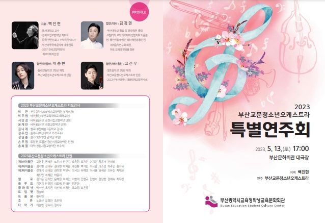 [제주교통복지신문 김강석 기자] 부산광역시교육청학생교육문화회관은 5월 13일 오후 5시 남구 부산문화회관 대극장에서 2023년 부산교문청소년오케스트라 특별연주회를 개최한다.