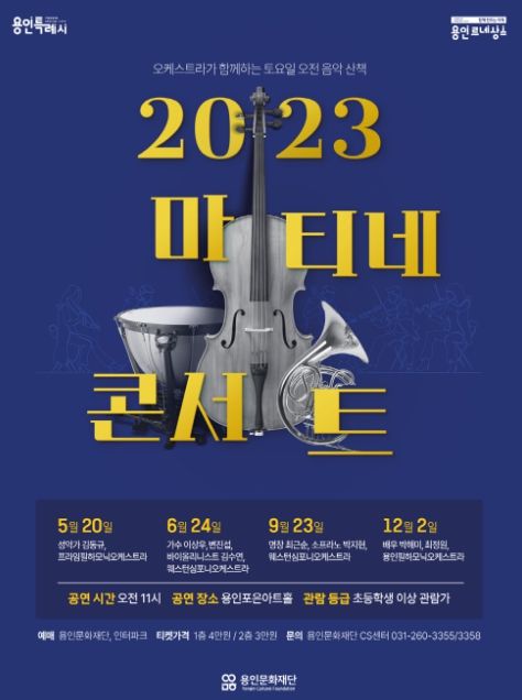 [제주교통복지신문 김강석 기자] 용인문화재단의 대표적인 기획공연 '마티네콘서트'가 2023년에도 오는 5월부터 12월까지 용인포은아트홀에서 개최한다.