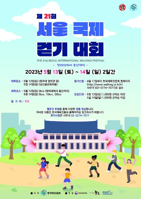[제주교통복지신문 김강석 기자] 청와대 개방과 용산시대 개막 1주년을 기념해 천 명의 시민이 청와대에서 최근 새롭게 개방된 용산어린이정원까지 함께 걷는다. 문화체육관광부가 후원하고 (사)한국체육진흥회가 주최하는 ‘제21회 서울국제걷기대회’는 5월 13일 코스를 청와대에서 시작해 용산어린이정원에 도착하는 코스로 운영한다.