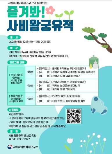 ‘즐겨봐! 사비왕궁유적’은 누구나 무료로 참여할 수 있으며, 10세 이하 어린이는 보호자 동행 하에 참여할 수 있다. 참가 신청은 네이버에서 ‘사비왕궁유적 홍보교육관’을 검색하여 예약하거나 전화로 문의하면 된다.