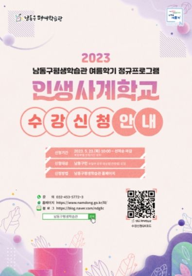 [제주교통복지신문 김강석 기자] 인천시 남동구는 23일부터 ‘2023년 여름학기 인생사계학교’ 프로그램 수강생을 모집한다고 12일 밝혔다.