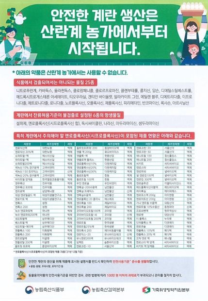 계란 살충제 검사에서 부적합 확인시에는 계란 출하중지, 회수‧폐기 조치 및 부적합 농가에 대해 전문방제업체를 지정하여 해충방제를 실시하고 원인조사를 통해 위반이 확인된 농가는 과태료 등 행정처분을 실시할 계획이다.