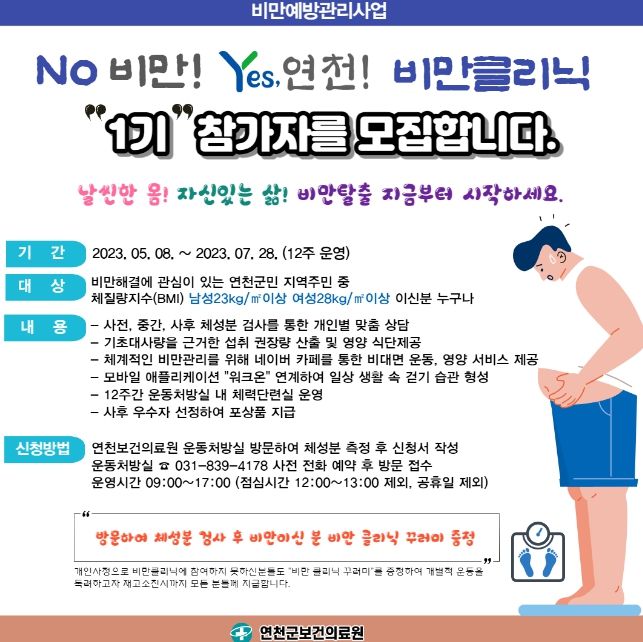[제주교통복지신문 김강석 기자] 연천군보건의료원은 ‘NO 비만! YES연천 비만클리닉 1기’ 참가자를 모집한다고 12일 밝혔다.