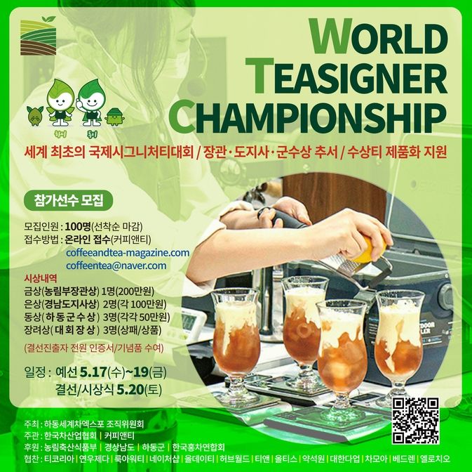 세계 최초의 글로벌 티메뉴 대회인 올해 ‘월드 티자이너 챔피언쉽(WTC)’에는 해외선수 3명을 포함해 총 50여 명의 도전자들이 참가한다. 이들은 5월 17~19일까지 3일간의 예선을 거치게 되며, 여기서 뽑힌 15명의 결선 진출자들이 20일 재격돌을 통해 금상(농림축산식품부 장관상) 1명, 은상(경상남도지사상) 2명, 동상(하동군수상) 3명, 장려상 3명의 주인공을 가리게 된다.