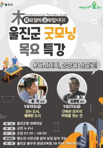 아울러,'울진군 굿모닝 목요특강'은 울진군 공식 유튜브 채널(경북울진군)을 통하여 다시보기가 가능하다.