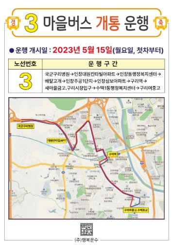 [제주교통복지신문 김강석 기자] 구리시는 오는 5월 15일부터 마을버스 3번 노선을 신설하고 운행을 개시한다고 밝혔다.