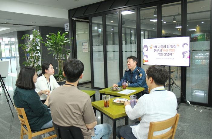 [제주교통복지신문 김강석 기자] 대전동부경찰서에서는 5월 가정의 달을 맞이하여 5월 12일 14시30분 동부경찰서 1층 구내 카페(이스트폴)에서 업무와 육아를 병행하고 있는 소속 직원 4명과 경찰서장이 참석한 가운데 소통 차담회를 실시했다.