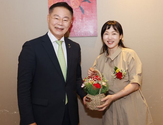 김재욱 칠곡군수는 스승의 날을 맞아 선생님들의 모임에서 회장을 맡은 장혜원 씨에게 할머니들이 마련한 카네이션과 꽃바구니를 전달했다.