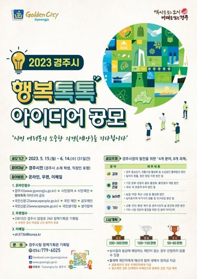 [제주교통복지신문 김강석 기자] 경주시가 시민들의 창의적인 아이디어를 시정 발전에 접목하고자 ‘2023 경주시 행복톡톡 아이디어 공모전’을 진행한다고 14일 밝혔다.