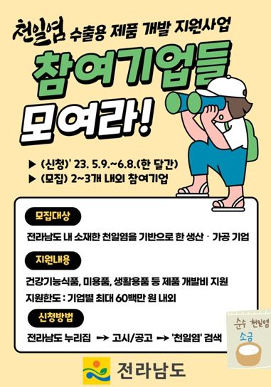 ‘천일염 수출용 제품 개발 지원사업’은 오는 6월 8일까지 접수하며, 자세한 내용은 전남도 누리집 고시/공고에서 확인해 신청하면 된다.