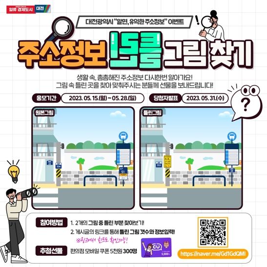 [제주교통복지신문 김강석 기자] 대전시는 전 국민을 대상으로 알면 유익한 주소정보를 알리기 위해 15일부터 28일까지 주소정보 틀린그림찾기 이벤트를 진행한다고 밝혔다.