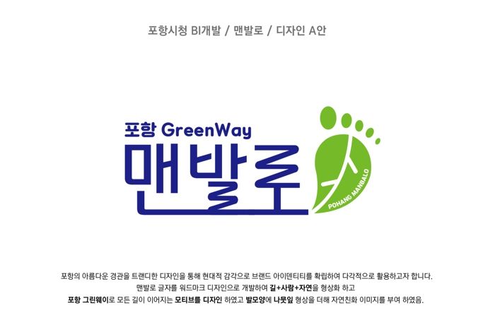 ‘맨발로(路)’는 생활권과 가까운 도시숲, 수변공간에 조성된 맨발 걷기가 가능한 포항의 산책로를 의미하며, ‘맨발로 BI’는 모든 길이 포항 그린웨이로 이어진다는 기본 모티브에 ‘길+사람+자연’을 형상화해 디자인했다.