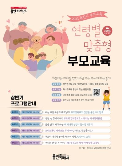 [제주교통복지신문 김강석 기자] 용인특례시가 18일부터 7월 20일까지 ‘2023년 상반기 연령별 맞춤형 부모 교육’을 실시한다고 14일 밝혔다. 용인특례시는 교육을 통해 ‘사랑하는 자녀를 향한 세상 모든 부모의 마음 읽기’를 위한 방안을 지원할 예정이다.