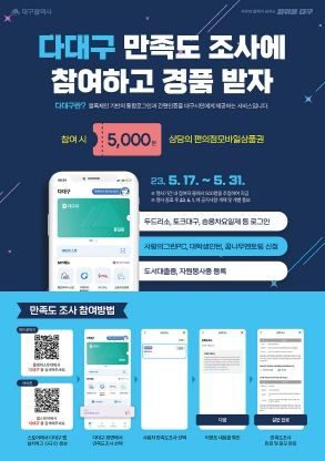 참여방법은 플레이스토어, 앱스토어에서 다대구 검색 후 설치하고, 만족도조사 후 이벤트 참여 배너를 클릭하면 된다. 이벤트 기간은 5월 17일 오전 9시에서 5월 31일 오후 6시까지이며 당첨자 발표는 6월 1일 앱 공지사항 게재 및 개별 통보한다.