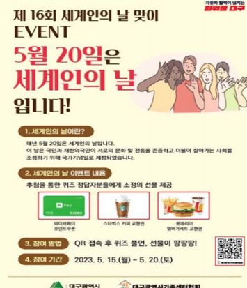 대구 시민으로서 세계인의 날 의미를 되새기고, 다름을 존중하고 다양성을 포용하는 사회적 분위기 확산을 위해 온라인 이벤트를 실시한다. 5월 15일부터 5월 20까지 현수막 또는 온라인 배너상 QR코드를 통해 접속하여 퀴즈를 맞히면 대구가족센터협회에서 520명을 추첨해 소정의 기념품(5,000원 상당 기프티콘)을 증정할 예정이다.