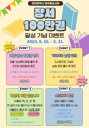 장서 100만 권 달성을 기념해 미추홀도서관에서는 5월 말까지 다양한 이벤트를 진행한다. 먼저 대출·반납 확인증을 추첨해 경품을 증정하는 '대출·반납 확인증 응모', 도서명으로 구성된 문제를 풀고 경품에 응모하는 '가로세로 낱말 퀴즈', 이름에 ‘백, 만, 권’중 한 글자 이상 들어가는 이용자에게 대출 권수 2권 추가 등의 혜택을 제공하는 '백만권씨를 찾습니다'와 연체 해제권 등을 제공하는 '스크래치 복권' 이벤트를 운영할 예정이다.