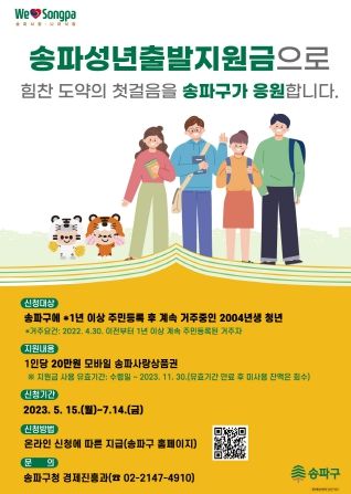 신청 및 접수기간은 성년의 날인 5월 15일부터 7월 14일까지다. 송파구청 누리집에서 회원가입 후 ‘성년출발지원금’ 메뉴에서 온라인 신청하면 된다. 별도 제출 서류는 없다.