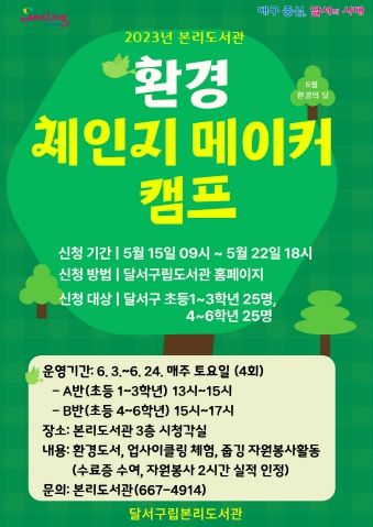 [제주교통복지신문 김강석 기자] 대구 달서구는 15일부터 달서구 초등학생을 대상으로 운영하는 2023년 본리도서관 환경체인지 메이커 캠프 참가 신청자를 달서구립도서관 홈페이지에서 선착순으로 모집한다고 밝혔다.