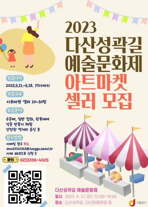 [제주교통복지신문 김강석 기자] 서울 중구가 '2023 다산성곽길 예술문화제 아트마켓'에 참가할 판매자를 모집한다고 15일 밝혔다.