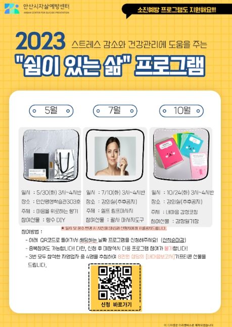 신청은 관내 자영업자나 자영업 관련 종사자라면 안산시자살예방센터 누리집(홈페이지)이나 공식 인스타그램을 통해 접속한 뒤 QR코드로 접수하면 된다.