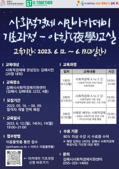 [제주교통복지신문 김강석 기자] 김해시는‘2023년 사회적경제 시민아카데미 기초과정 야학(夜學)교실’수강생을 모집한다고 15일 밝혔다.