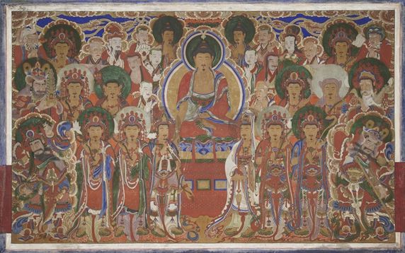 ‘전등사 강설당 아미타불탱’은 아미타여래가 극락정토에서 설법하는 모습을 담은 불화로 화폭 50cm, 110cm, 93cm(우측부터) 크기의 광목천 3매를 세로로 이어 붙여 완성했다.