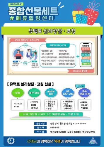 [제주교통복지신문 김강석 기자] 대전광역시교육청 에듀힐링센터는 학생, 학부모, 교직원의 마음건강 및 교육활동보호를 위하여 '5월 감사의 달 종합선물세트'를 모든 학교에 선물했다고 밝혔다.