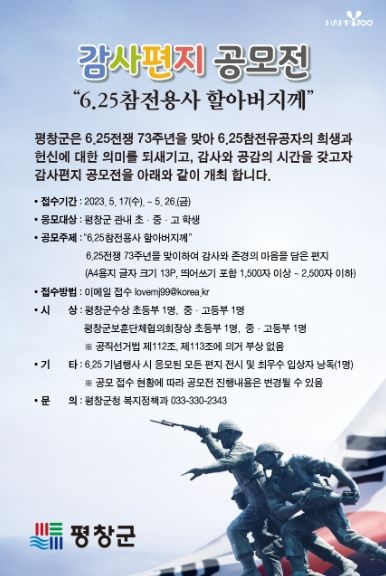 접수 기간은 5월 17일부터 5월 26일까지 10일간으로, 6.25참전유공자에 대한 감사와 존경의 마음을 담은 편지(A4용지 1장 내외)를 이메일을 통해 접수받으며, 자세한 내용은 평창군 홈페이지를 통해 확인할 수 있다.