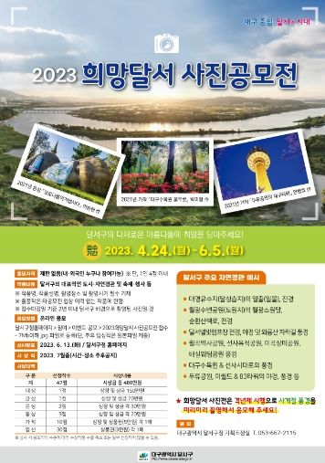 이번 사진 공모전은 4월 24일부터 6월 5일까지 내·외국인 제한 없이 전 국민 누구나 1인당 4점 이내로 응모할 수 있으며, 달서구 온라인 홈페이지 내 2023희망달서사진공모 코너를 통해 작품을 접수 받는다.